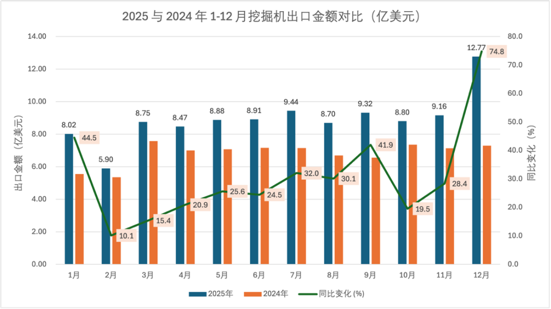 Saka data saben wulan, kinerja ekspor crawler excavator rapet selaras karo pasar sakabèhé, kanthi nilai ekspor siji sasi $ 1.228 milyar ing Desember, nandhani kenaikan 74.0% taun-taun, lan volume ekspor 34.000 unit, munggah 65.0% taun-taun, nuduhake wutah sing signifikan ing pungkasan taun. Ing babagan owah-owahan taun-taun, nilai ekspor lan volume entuk wutah positif ing kabeh sasi, kanthi volume September mundhak 57,9% lan nilai Desember mundhak 74,0%, dadi sorotan utama pertumbuhan taun.