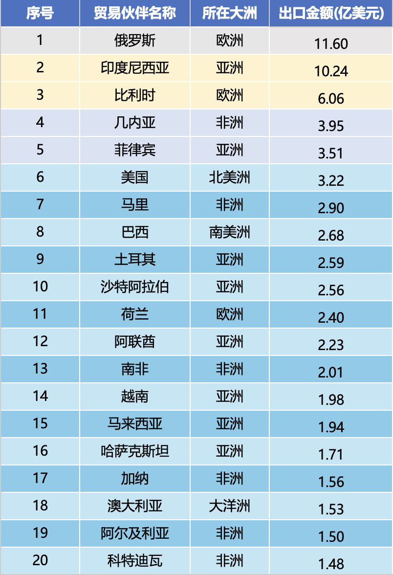 Saka peringkat jumlah ekspor wiwit Januari nganti Desember 2025, sepuluh mitra dagang paling dhuwur yaiku Rusia ($1.16 milyar), Indonesia ($1.024 milyar), Belgia ($606 yuta), Guinea ($395 yuta), Filipina ($351 yuta), Amerika Serikat ($322 yuta), Mali ($290 yuta), Brazil ($268 yuta), Türkiye ($259 yuta), Arab Saudi ($259 yuta). Nilai ekspor total sepuluh pasar paling dhuwur tekan 4,93 milyar dolar AS, nyathet 45,9% saka total nilai ekspor, kanthi konsentrasi dhuwur ing pasar inti.