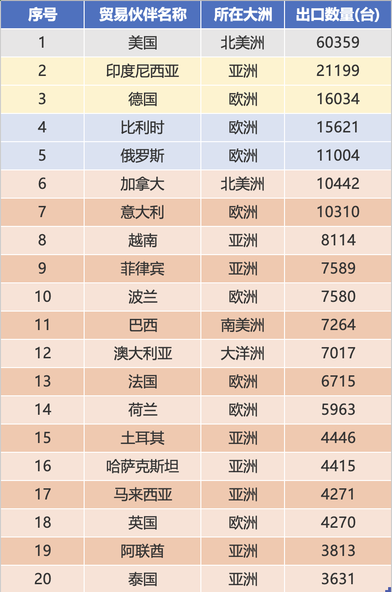 Miturut peringkat jumlah ekspor wiwit Januari nganti Desember 2025, sepuluh mitra dagang paling dhuwur yaiku Amerika Serikat (60359 unit), Indonesia (21199 unit), Jerman (16034 unit), Belgia (15621 unit), Rusia (11004 unit), Kanada (10442 unit), Italia (10442 unit), Italia (10310 unit), Italia (10310 unit), unit), lan Polandia (7580 unit). Jumlah total ekspor saka sepuluh pasar paling dhuwur tekan 168000 unit, nyathet 53,1% saka total ekspor, nyoroti efek skala.