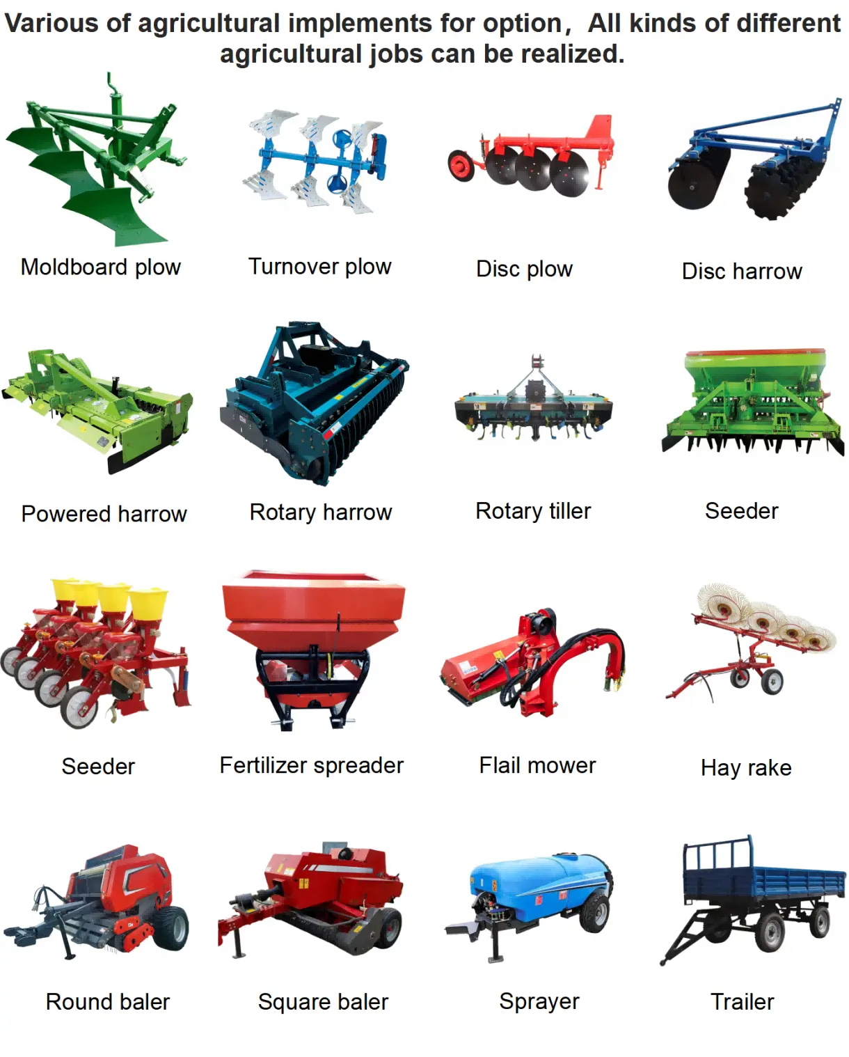 Ing sistem produksi tetanèn modern, traktor, minangka peralatan daya inti, mung bisa entuk potensial lengkap karo cocog ngelmu lan cocok saka ngiringipiranti tetanèn. Seperangkat alat pertanian sing nyukupi kabutuhan produksi nyata ora mung bisa ningkatake efisiensi kabeh proses tani, nyebar, lan manajemen lapangan, nanging uga nyuda konsumsi energi lan nyandhang peralatan, saéngga nggawe bathi sing luwih dhuwur kanggo para petani.